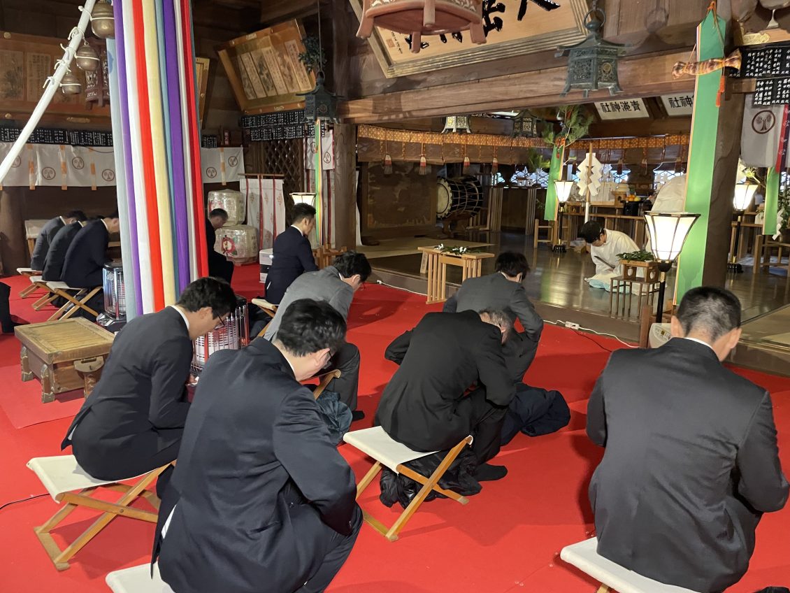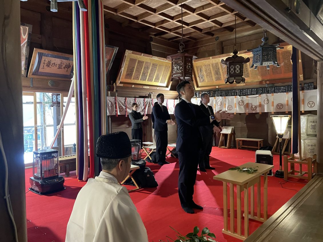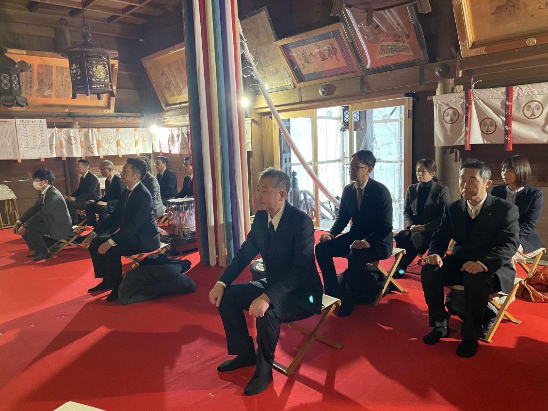仕事始めである本日、当社創業の地である新潟県加茂市の青海神社にて、新年安全祈願祭を行いました。祈願祭では、社長の小柳、専務の中靜、常務の澁谷がそれぞれ玉串を奉奠し、従業員を代表して参列した部長とともに、今年一年間の無事故・無災害、社業発展を祈願しました。